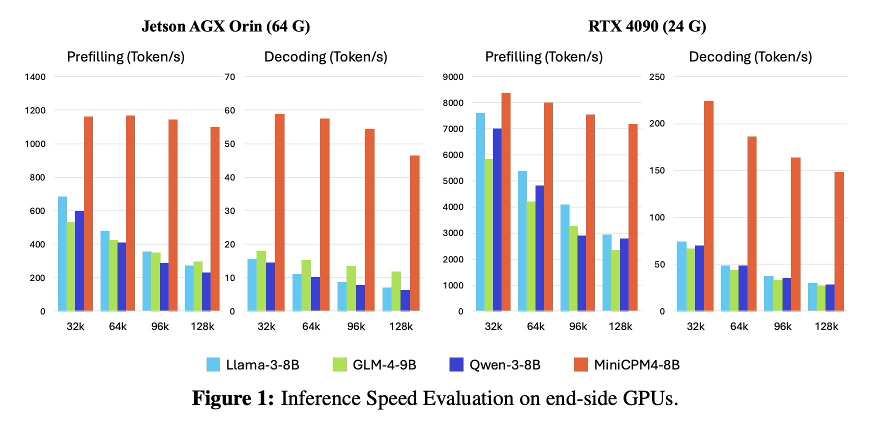 MiniCPM 4.1 processes long documents 7 times faster than Qwen3-8B on edge devices. When handling 128,000 words, it maintains this speed advantage throughout.