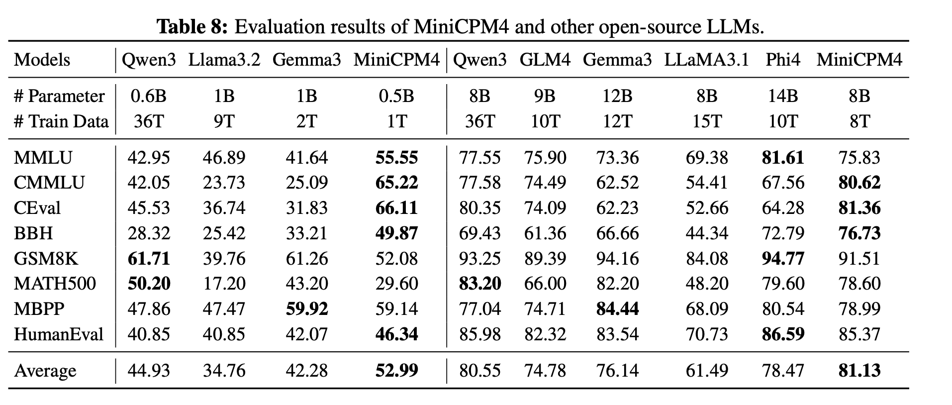 The team trained MiniCPM 4.1 on just 8 trillion tokens of high-quality data. Compare this to Qwen3-8B, which needed 36 trillion tokens to reach similar performance. MiniCPM achieves the same results with just 22% of the training data. They filtered out low-quality content and generated reasoning-intensive data specifically for math and coding tasks.