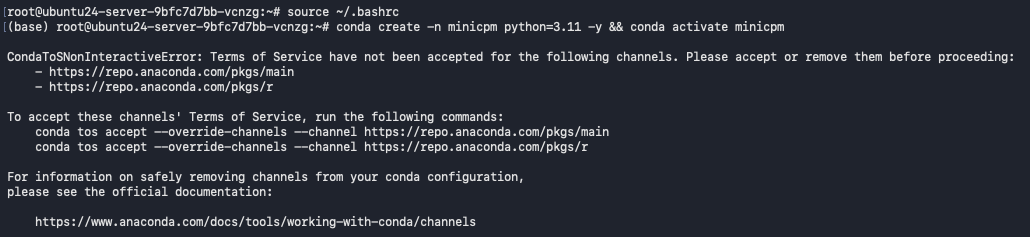 We’ll now create a new environment for MiniCPM and activate it, and Reloadthe shell so conda works right away: