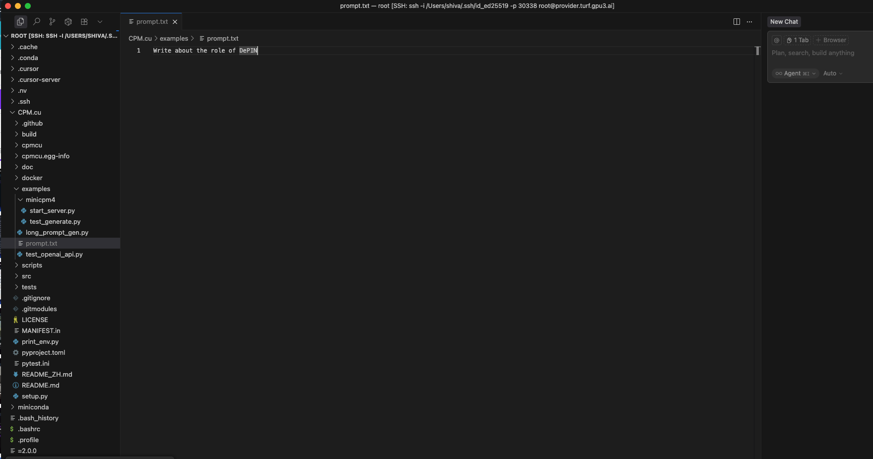 ssh -i <path-to-private-key> -p <port> root@<deployment-url>Now go to the CPM.cu folder > examples > Create a file named prompt.txt. In prompt.txt, you can add your prompt, which you want to run through MiniCPM 4.1. Save the file and go back to the terminal.