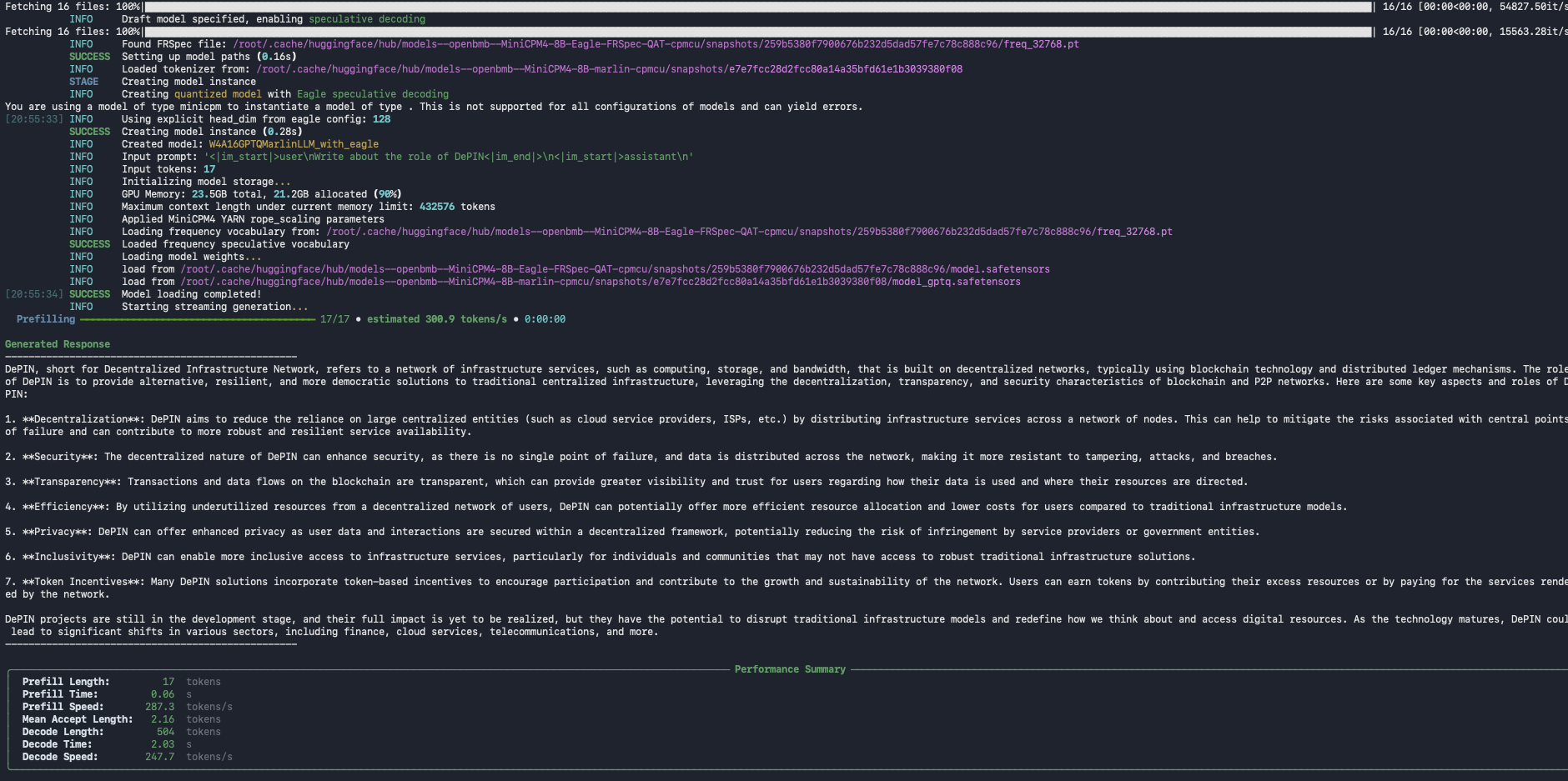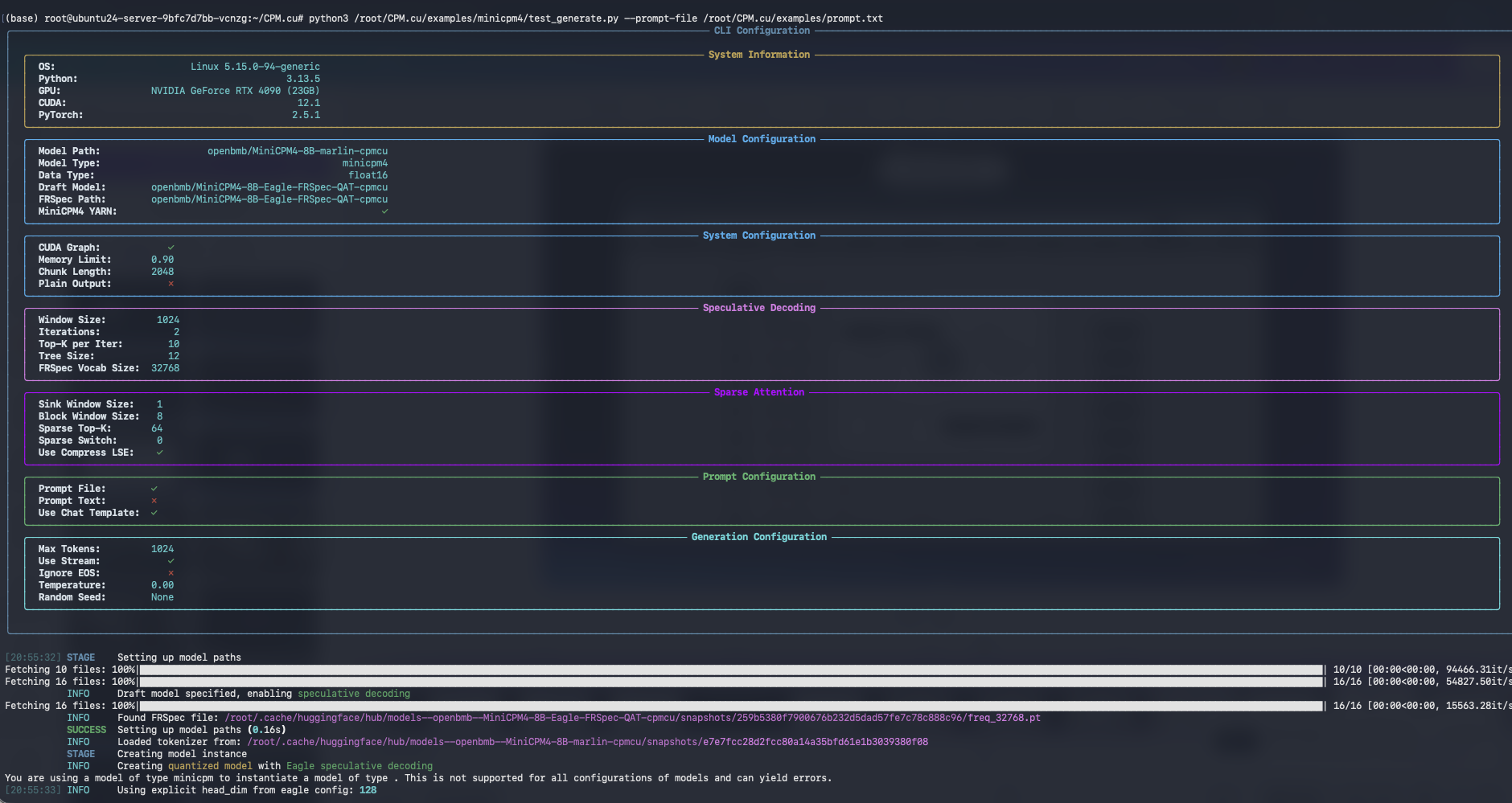 python3 /root/CPM.cu/examples/minicpm4/test_generate.py --prompt-file /root/CPM.cu/examples/prompt.txtThis will load the MiniCPM model, generate text for the prompt, and print results in the terminal.