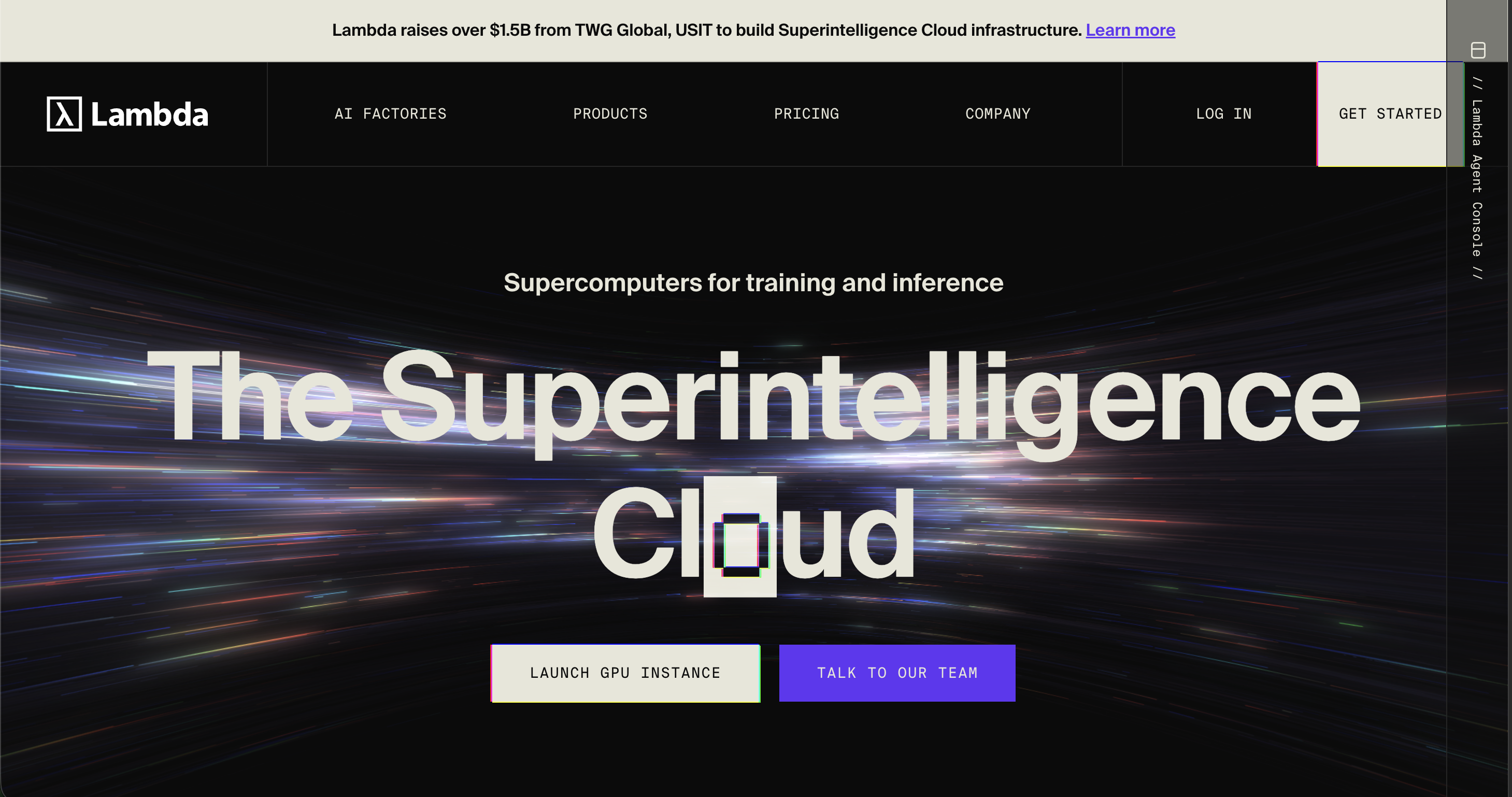Lambda focuses on high-throughput training with prebuilt environments (Lambda Stack), InfiniBand networking, and 1-click multi-GPU clusters. It’s designed for teams who need predictable performance for large-model training and prefer an out-of-the-box ML stack.