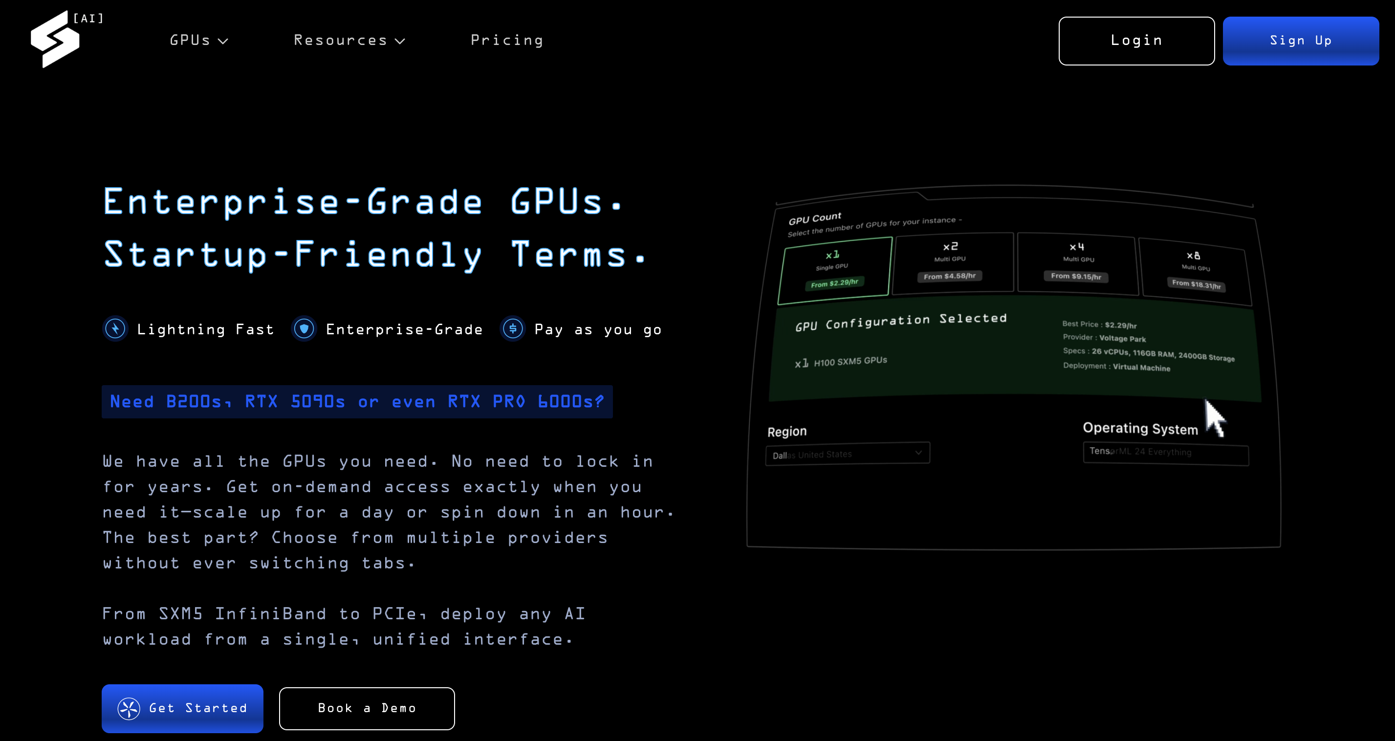 | GPU Model | Type | Starting Price (USD/hour) | Notes | | --- | --- | --- | --- | | NVIDIA H100 SXM5 | VM | ~$1.21/hr | Strong for LLM training | | NVIDIA A100 80GB | VM | ~$0.73/hr | Good for mid-size LLMs and CV models | | NVIDIA L40S | VM | ~$0.69/hr | Best for inference workloads | | NVIDIA RTX 4090 | VM | ~$0.55/hr | Great for fine-tuning and diffusion models | | NVIDIA A6000 | VM | ~$0.24/hr | Affordable for research workloads | | B300 SXM6 | VM | ~$1.49/hr | Latest powerful GPU which can handle any task |